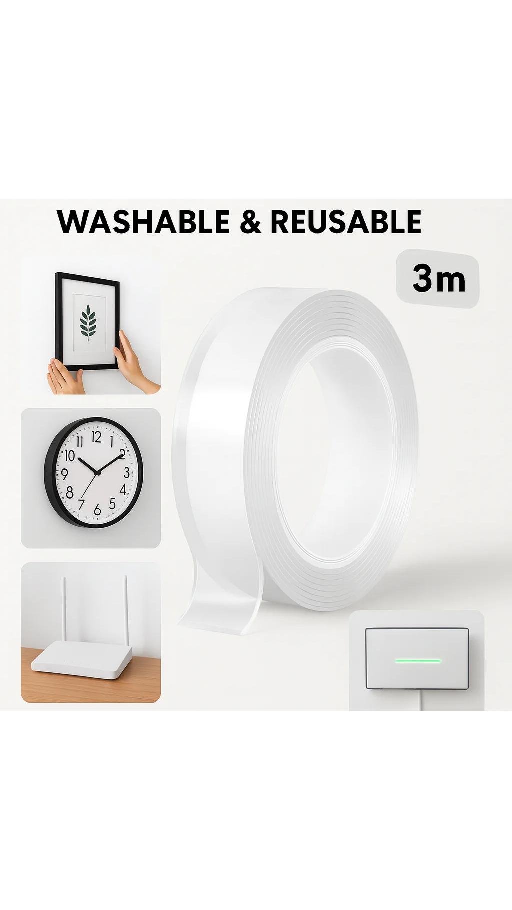The Nano Tape (3 Meter) Double-Sided Tape | Washable & Reusable is a smart adhesive solution perfect for your home, office, or workshop. This transparent & versatile tape delivers strong adhesion on smooth surfaces such as glass, metal, plastic & wood.
