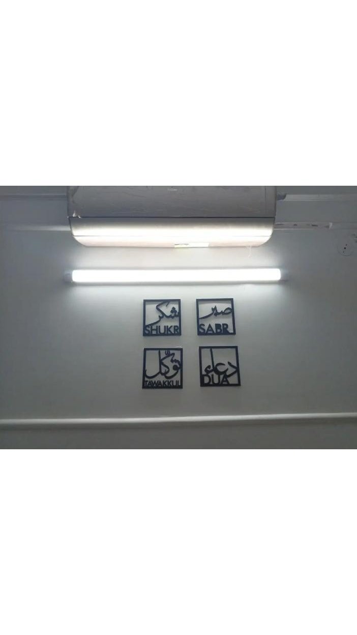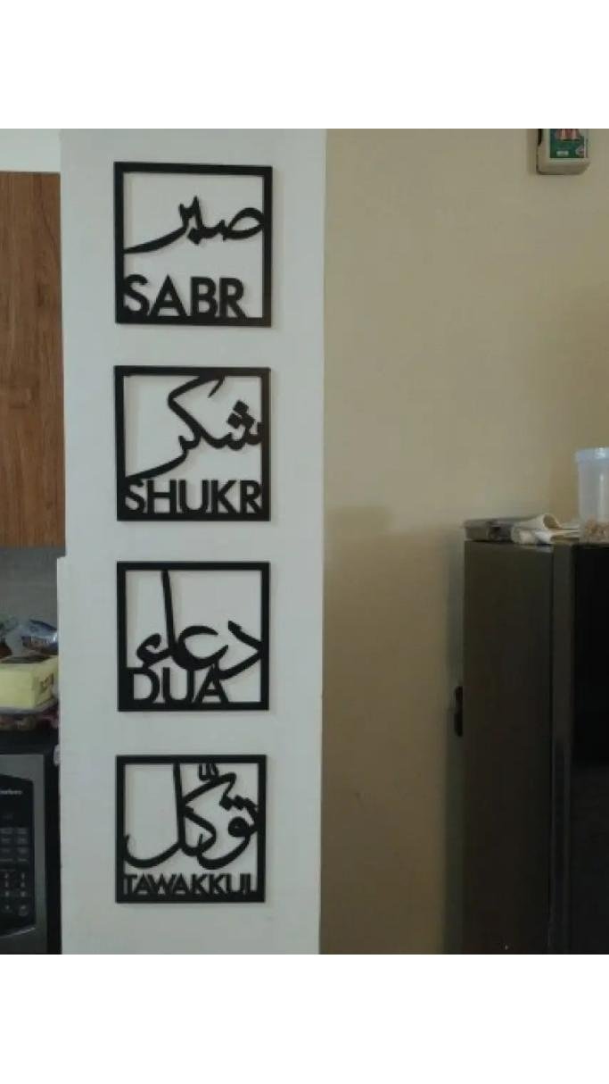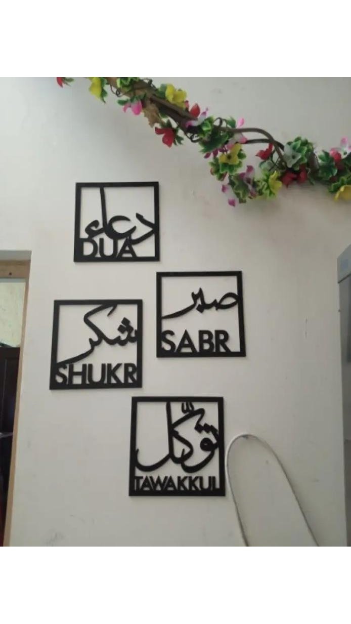 Transform your space with this elegant 4-piece Islamic calligraphy wall décor set, beautifully representing the four pillars of a believer’s life: Patience (Sabr), Gratitude (Shukr), Supplication (Dua), and Trust in Allah (Tawakkul).